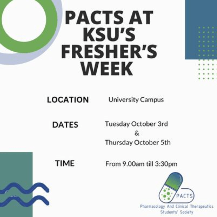 Excited to meet the future pharmacologists! π Swing by our stand at KSU Freshers’ Week on University Campus for all the inside scoop on your university journey. π Feeling a bit lost? No worries, PACTS has got your back β from day one to graduation day! π Get ready for timetables, lecture rooms, memberships, key dates, and pro tips for freshers. Got questions? We’ve got answers! π€ See you there! π