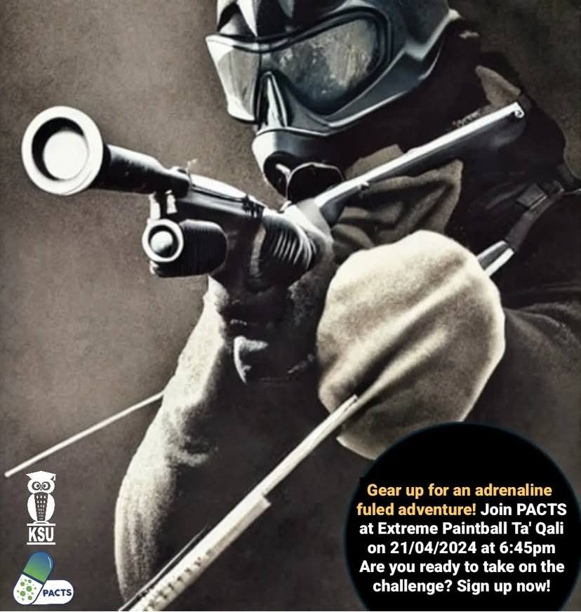 Get ready to paint the town… well, each other! Join PACTS for an epic paintball showdown at Extreme Paintball, Ta’ Qali on Sunday, April 21st, 2024 at 6:45 PM. Hurry! Limited spots available for the first 20 people. Act fast to secure your place in the battle! And guess what? This thrilling adventure is funded by KSU! Don’t miss out, tag your squad and sign up now (link in bio)!